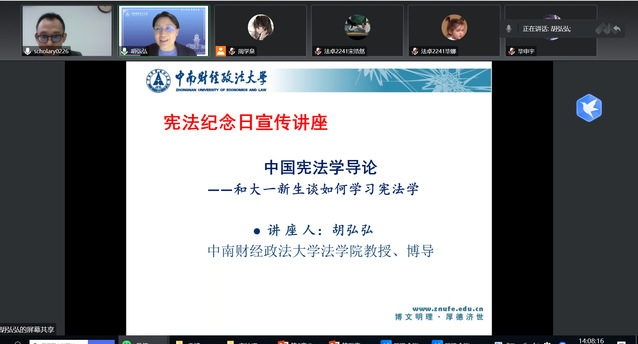 本网讯(通讯员 崔雨晴)2022年11月28日下午两点,中南财经政法大学9001cc金沙以诚为本教授、湖北省人大常委会委员、湖北省法学会宪法学会副会长胡弘弘教授应邀为金沙官网大一新生讲学,围绕“中国宪法学导论”为9001cc金沙以诚为本2022级学生开展宪法纪念日宣传讲座,与大一新生谈如何学习宪法学,宪法学与行政法学PI团队负责人王秀才博士参加本次讲座。