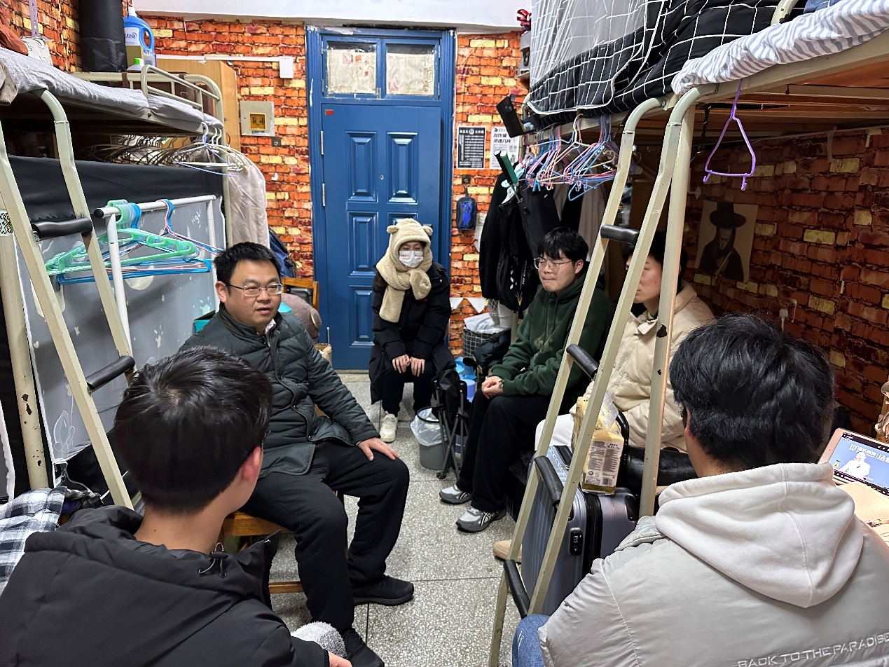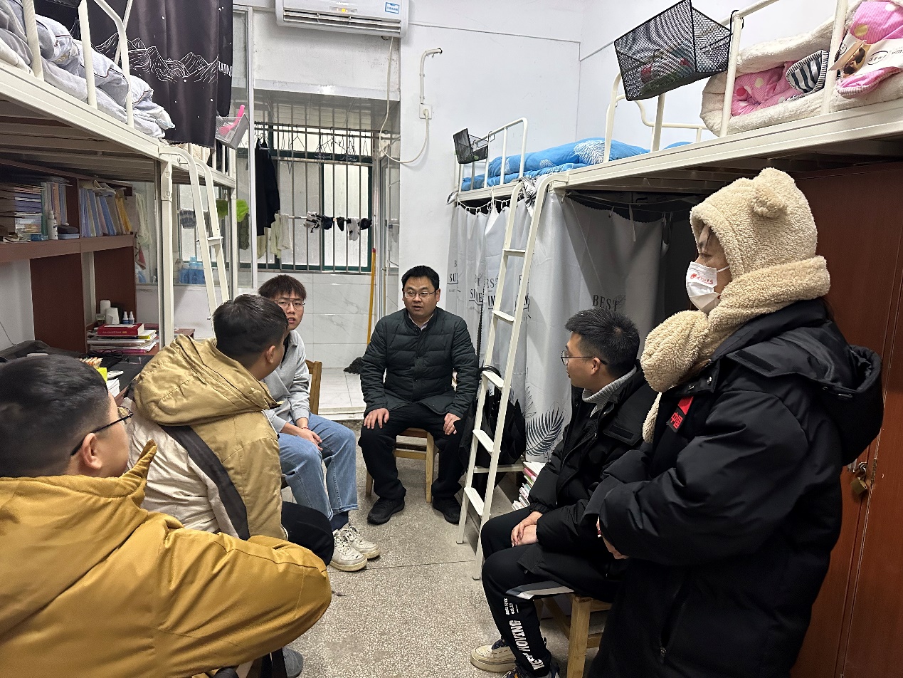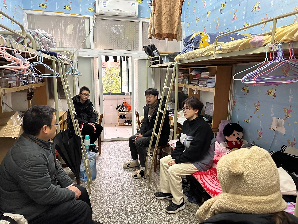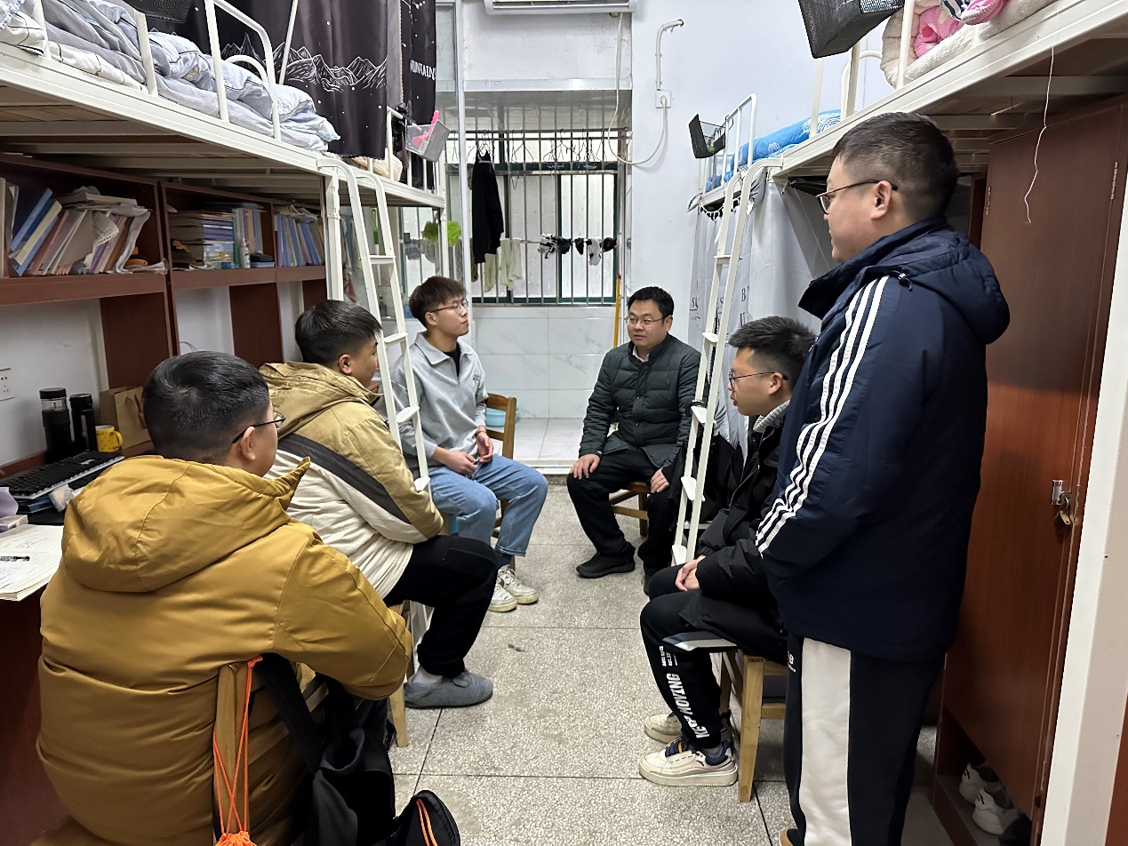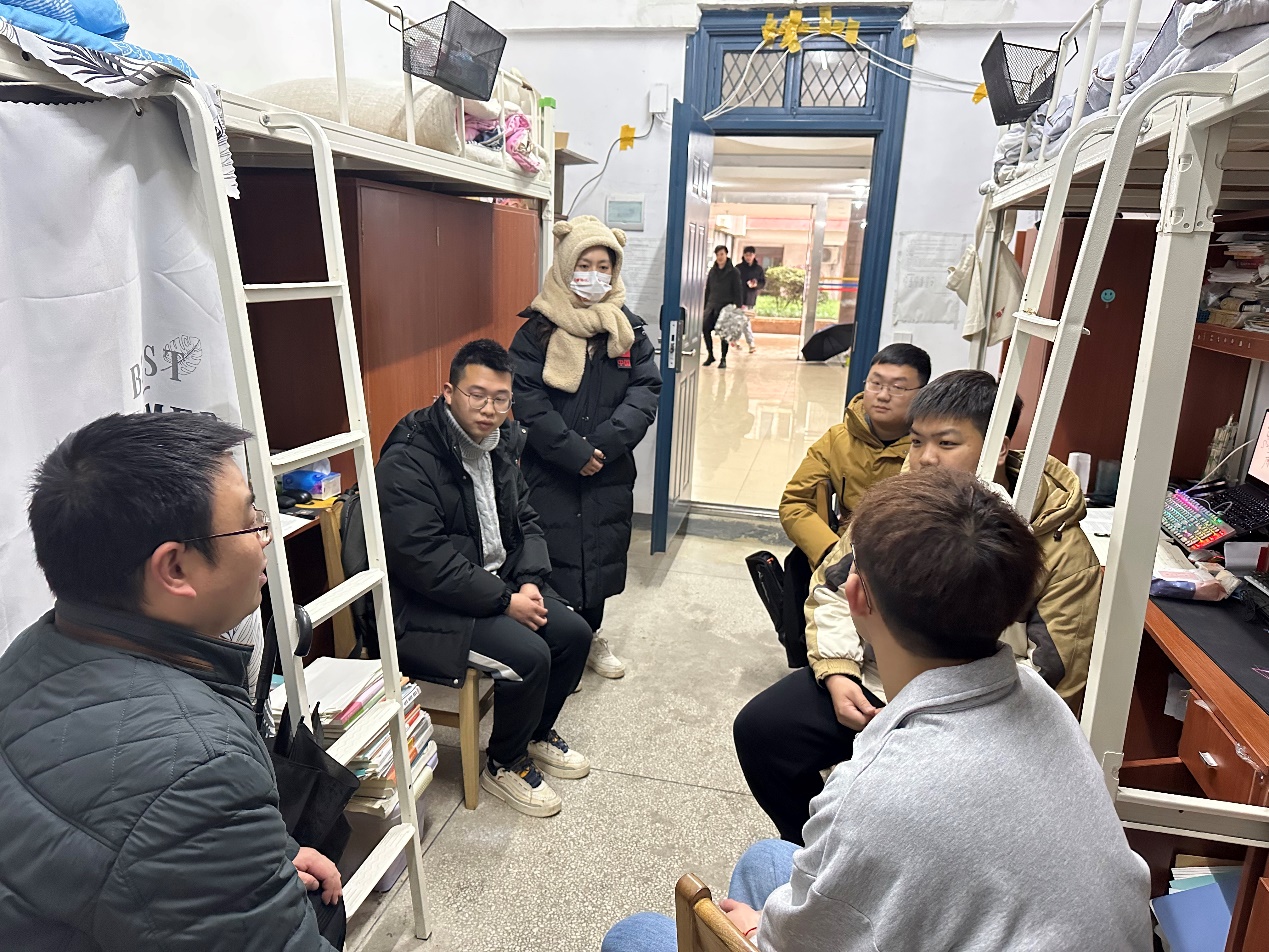 邱院长、杨书记带队分别走访了金沙官网桔六、栎二、栎五宿舍,走访过程中,老师们就实习、考研及毕业发展方向等问题对同学们进行了详细询问,对同学们提出的问题给出了建设性的意见,同时重点关注了同学们的心理状况和宿舍关系等,多次强调外出实习及在校期间的各项安全问题。