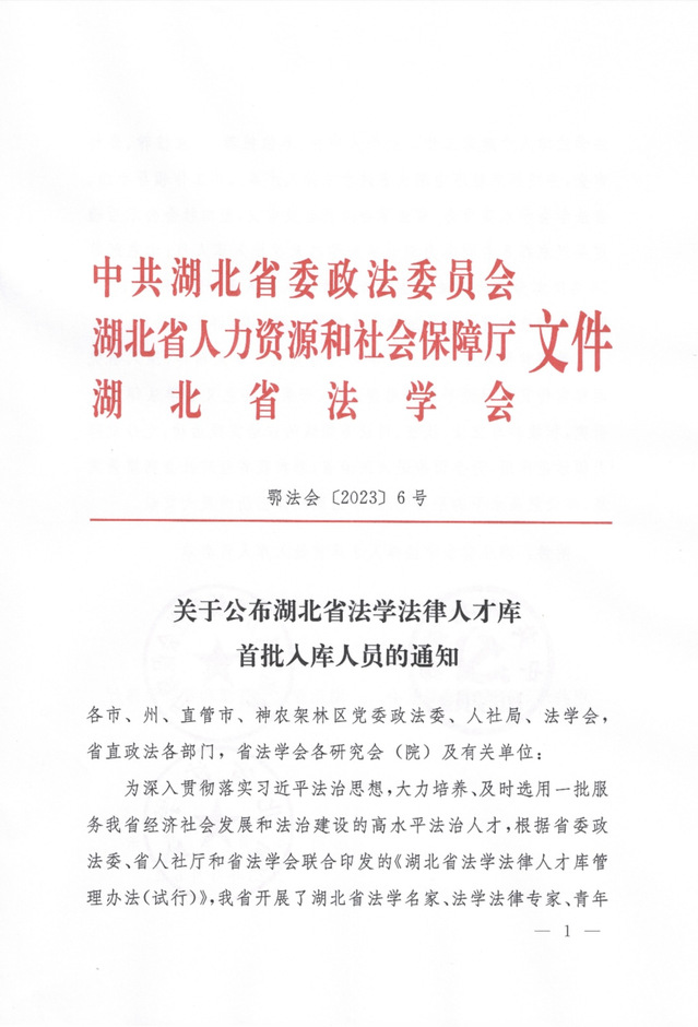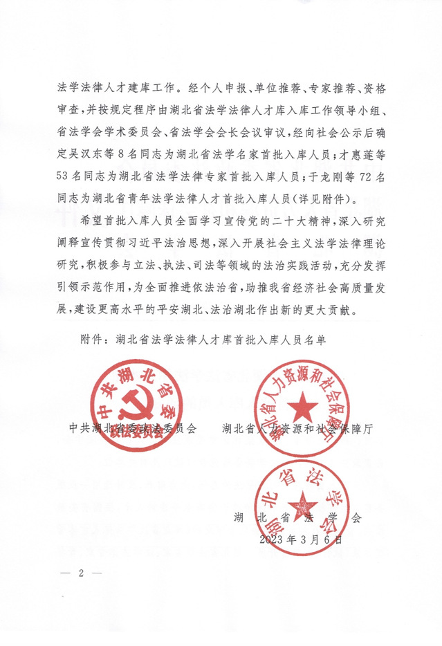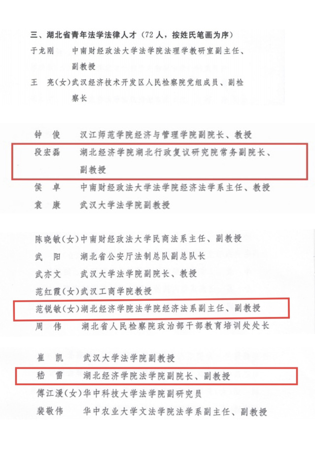 近日,湖北省首批法学法律人才库入库人员公布:我院共有五名教师入选,刘大洪、邱秋入选湖北省法学法律专家,范锐敏、段宏磊、嵇雷入选湖北省青年法学法律人才。