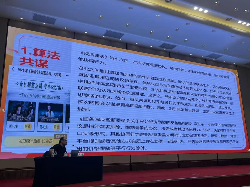 同时,讲解典型平台经济垄断行为的法律适用。段教授以常见的平台经济垄断行为(算法共谋,滥用平台内优势地位,妨碍平台互联互通,平台扼杀式并购)结合生活实际为大家讲解相关法律适用问题。最后,段教授以“阿里巴巴滥用市场支配地位强制‘二选一’”案和“虎牙、斗鱼经营者集中”案为大家介绍平台经济反垄断执法中的争议焦点。