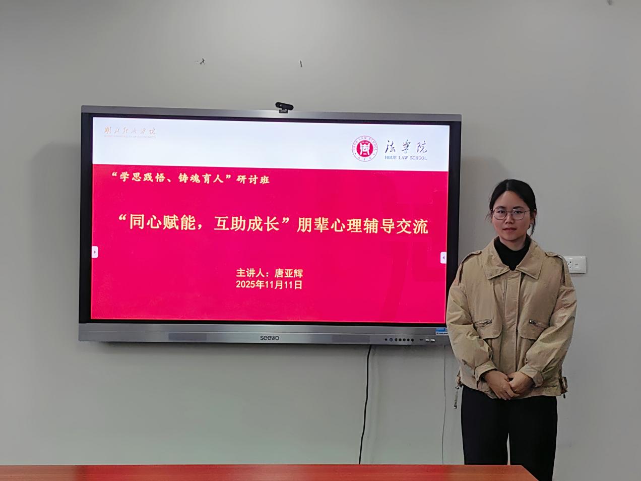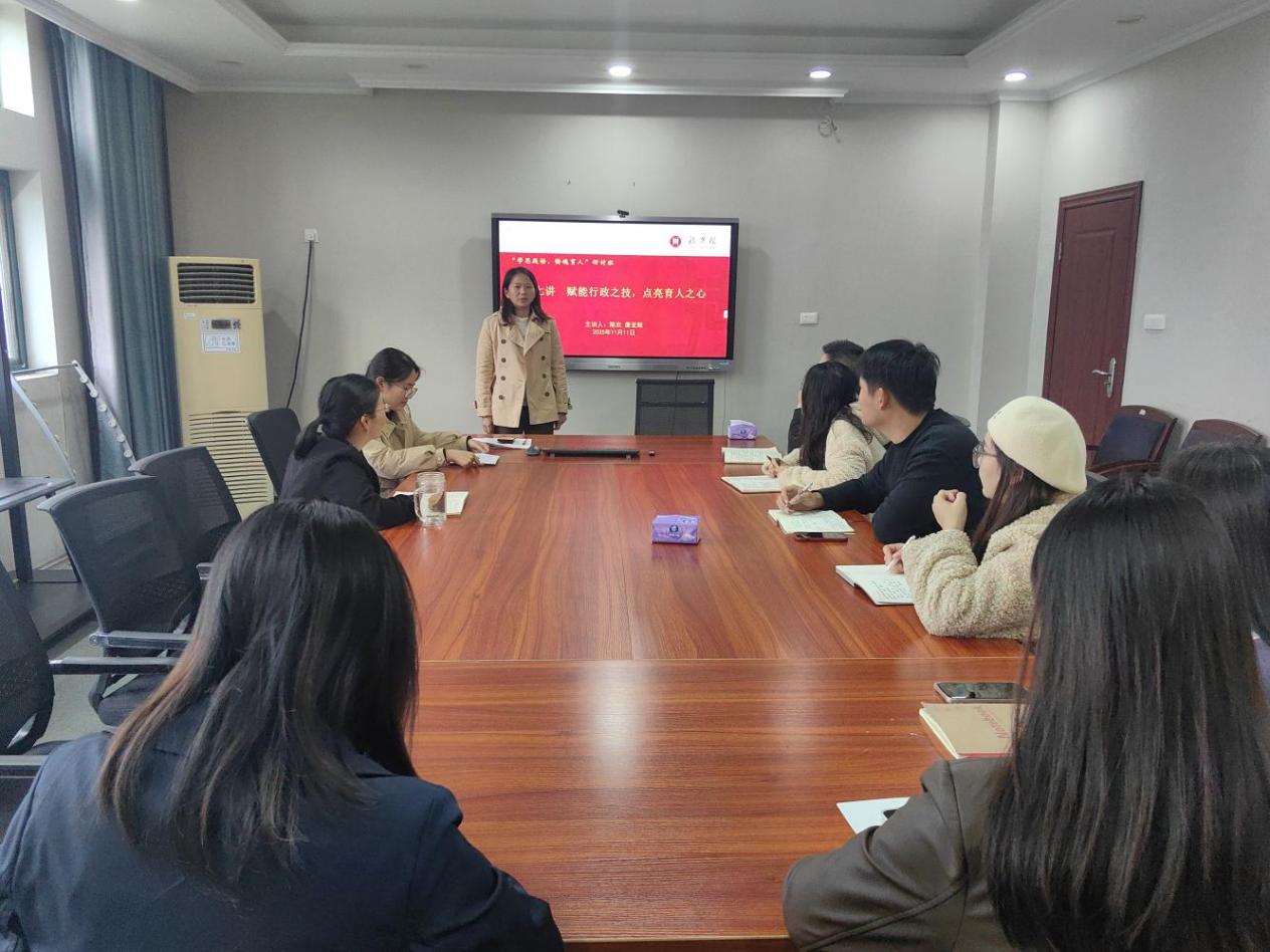本网讯(通讯员:唐亚辉)为深入贯彻落实学校“干部素质提升年”总体要求和工作部署,着力提升年轻干部的政治素养、担当意识与综合能力,2025年11月11日,9001cc金沙以诚为本“学思践悟、铸魂育人”系列研讨班第七讲在知行楼406会议室举行。本次讲座以“赋能行政之技,点亮育人之心”为主题,由陈欢和唐亚辉担任主讲,学院党委副书记钟彦姝主持,全体行政人员、辅导员参与。