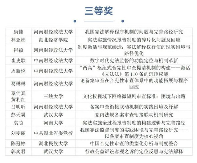 闭幕式上举行了青年学者优秀论文颁奖仪式。本次年会共收录各地高校学生投稿139篇,遴选出一、二、三等及优秀奖共计38篇获奖论文。我院法律硕士研究生林亚楠的论文《宪法实施情况报告制度的碎片化问题及回应》获得三等奖。