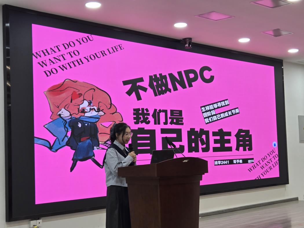 法学2441班苟予希以“不做NPC,活成自己的主角”为题,从个人成长与团队协作两方面展开,分享“四步计划法”时间管理、思维导图学习法及小组作业协作技巧,激励新生勇于探索、自主成长,在团队中绽放光彩。