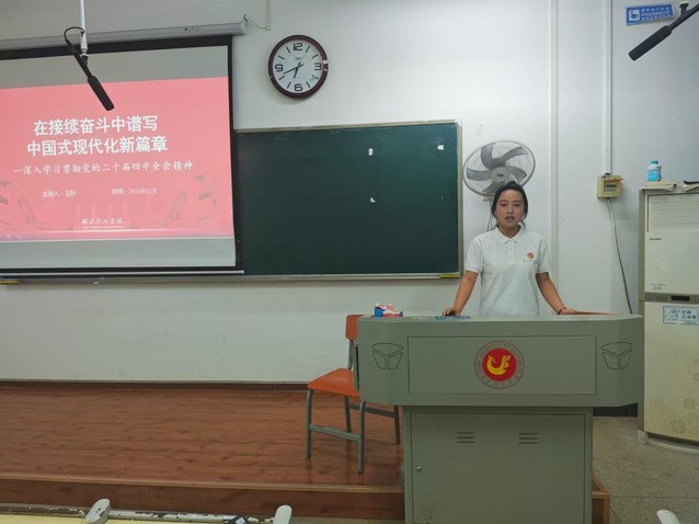 本网讯(通讯员:张昊岚、刘士畯)2025年11月23日晚,学校“经叹号”青年宣讲队队员王叶面向法学2441团支部,开展“深入学习贯彻党的二十届四中全会精神”主题宣讲。