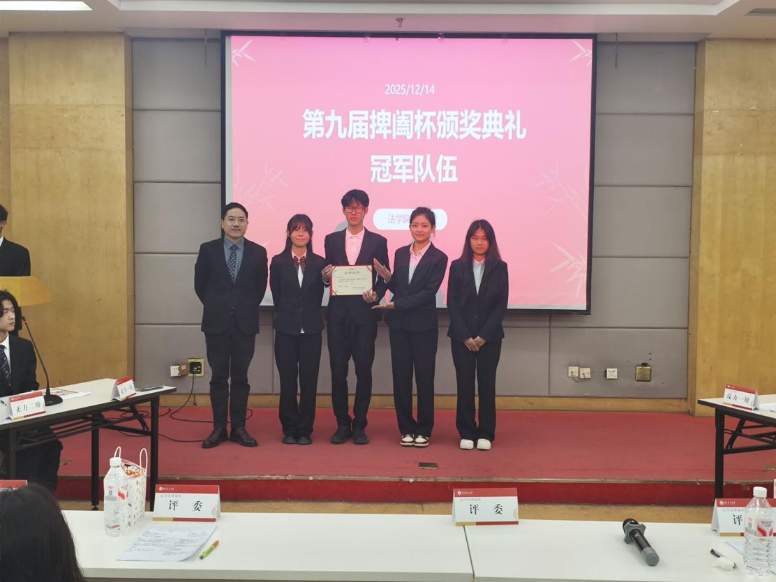 本网讯(通讯员:张怡帆)2025年12月14日,9001cc金沙以诚为本第九届“捭阖杯”辩论赛决赛在大学生活动中心举行。本次辩题聚焦社会热点与法律前沿,涵盖正当防卫、谐音商标侵权、无人驾驶伦理等议题,各队从法律、社会、案例等多角度展开深度论证。