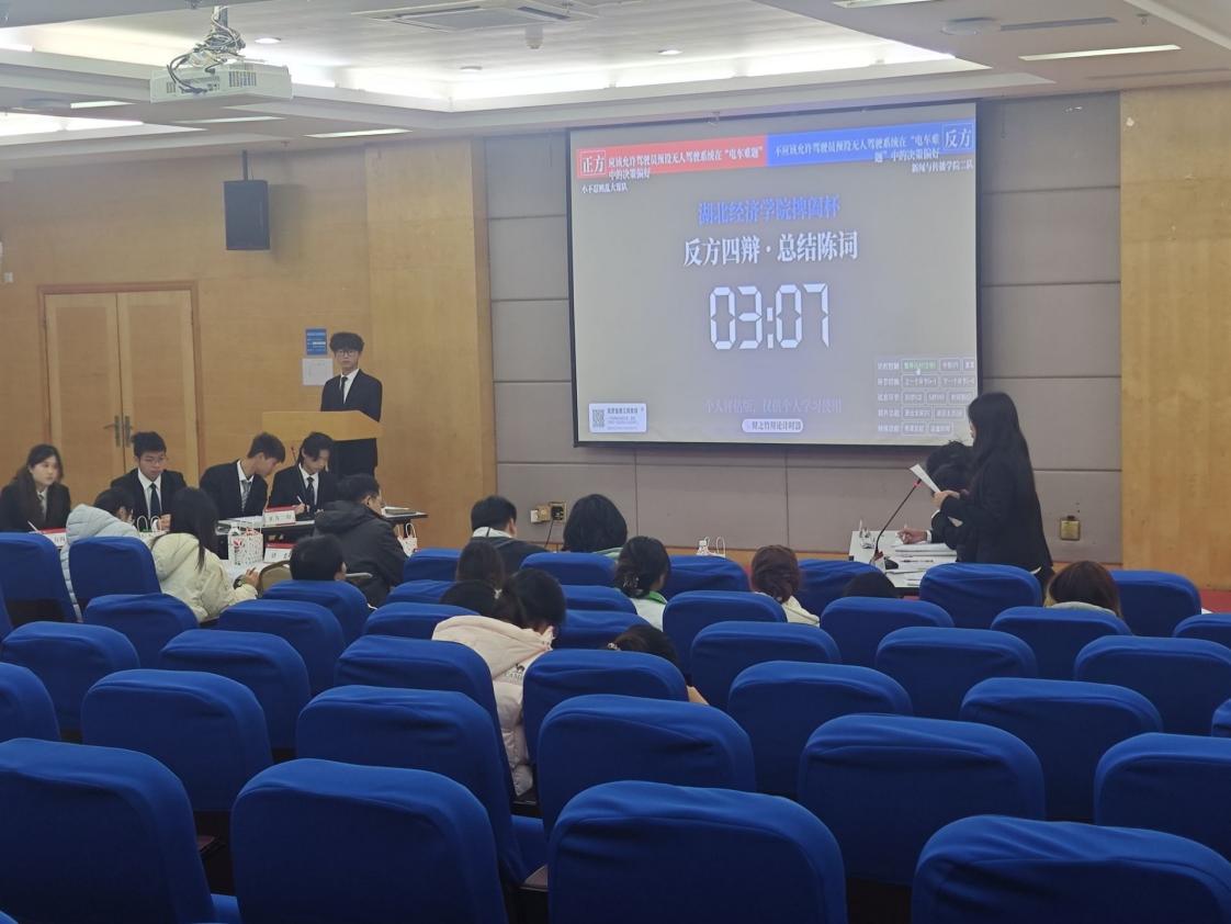 决赛在新闻与传播学院与财政与公共管理学院之间展开,双方围绕“无人驾驶决策偏好”进行交锋,从个体权利与公共利益双重维度呈现了严谨的逻辑与深刻的思辨。赛后评委对选手表现予以肯定,并剖析了辩题的社会与法律意义。