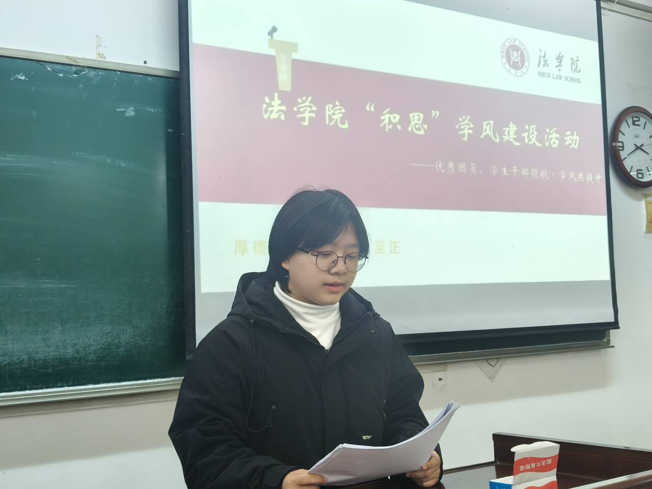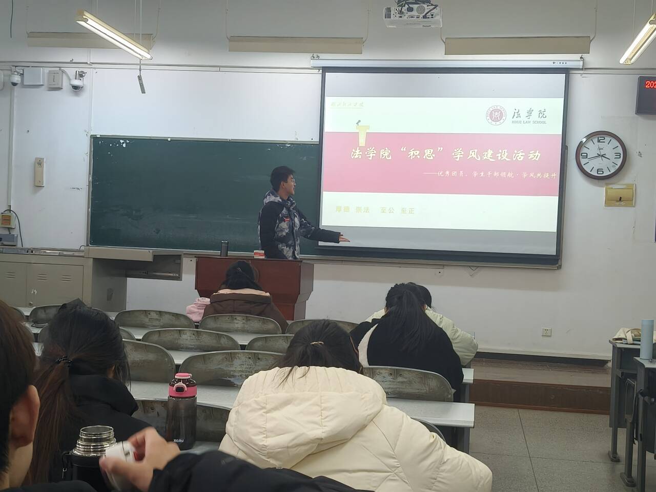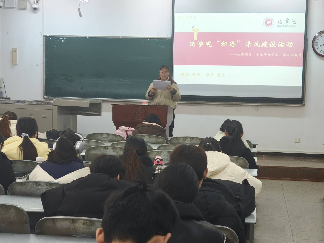 优秀团员代表黄丹毅以“以学为基,互助共进”为主题展开分享。她聚焦班级学风共建,结合自己参与“学习互助小组”的实践经验,向法学2441班同学介绍了“难题共解、资源共享、进度共赶”的互助模式。她呼吁同学们在班级内搭建学习交流平台,通过课堂讨论、课后答疑、资料互通等方式,让每一位同学都能在集体中获得成长,让互助之风成为班级学风的鲜明底色。“初心如磐,笃学不怠”,优秀团员代表黄鑫奕结合自身学习与团学工作经历,为法学2441班同学带来实用干货。她提出“目标拆解+高效复盘”的学习法,建议同学们将专业学习目标细化为每周、每日任务,通过定期复盘梳理知识漏洞;同时分享了参与法学学科竞赛的经验,鼓励大家以竞赛为契机深化专业理解,在团队协作中提升法律实务应用能力,让青春在勤学实干中绽放光彩。作为法学2441班的学习委员,李本强以“深耕专业,勇担使命”为核心分享成长路径与责任担当。他结合学委工作实践,分享了班级学风建设的计划,用实际行动诠释了“领航者”的责任,为班级学风建设提供了可落地的实践方案。